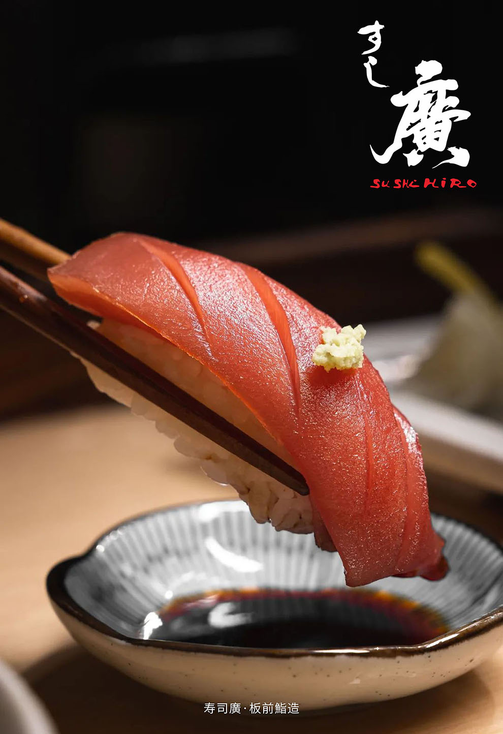 在品牌命名上,我们以寿司为餐饮品类核心,加上一个繁体的廣字,来源于创始人姓名中一个广字,即:寿司廣,亦如:寿司郎一样,命名简洁、传达高效。