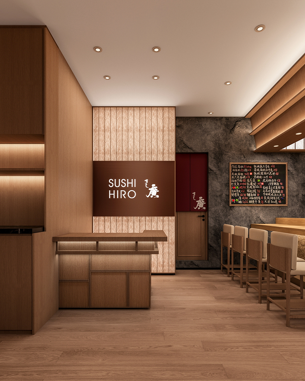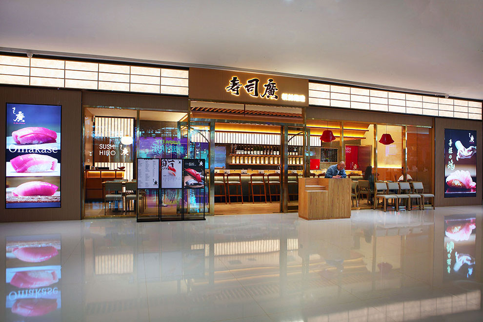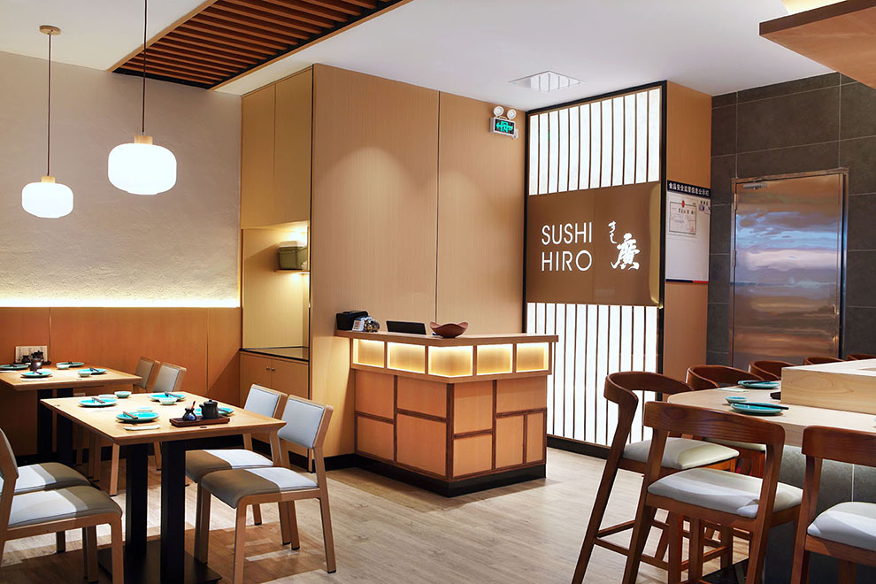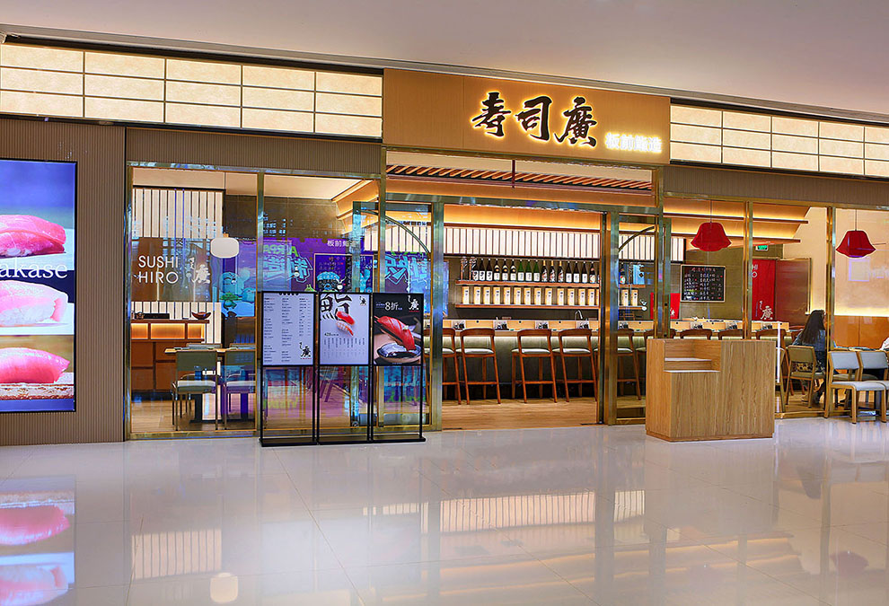标志的设计,我们以中文字体为核心,邀请书法老师泼墨挥毫,中文名为:寿司廣,英文名为:Suhi Hiro,日文名:すし廣,通过不同高低大小,形成不同组合应用不同场景。