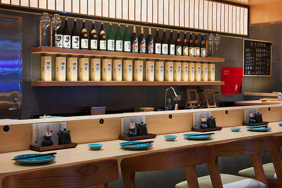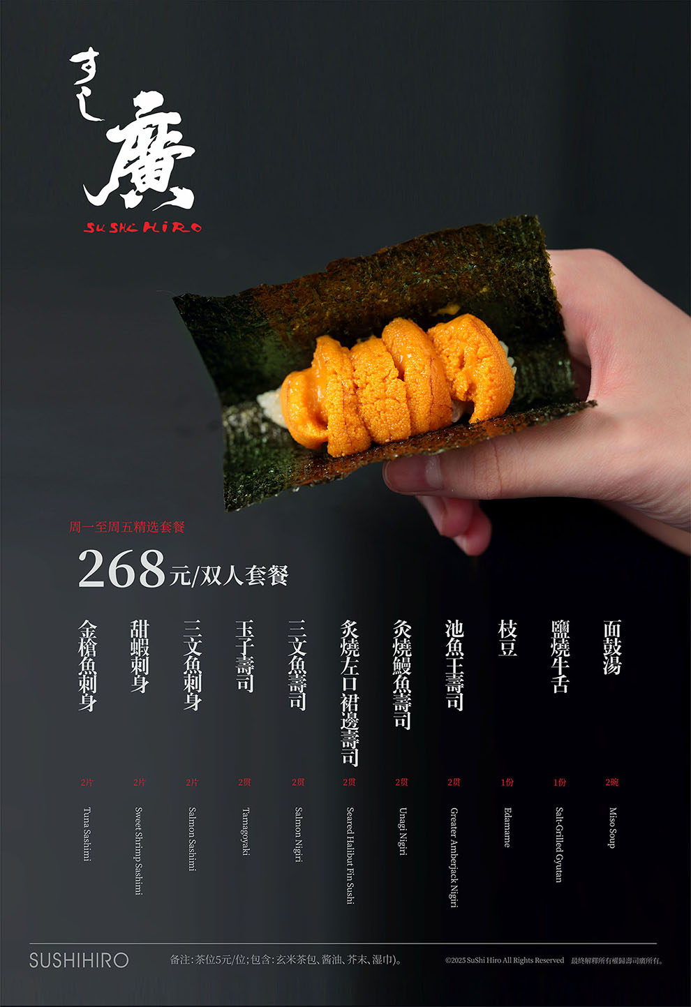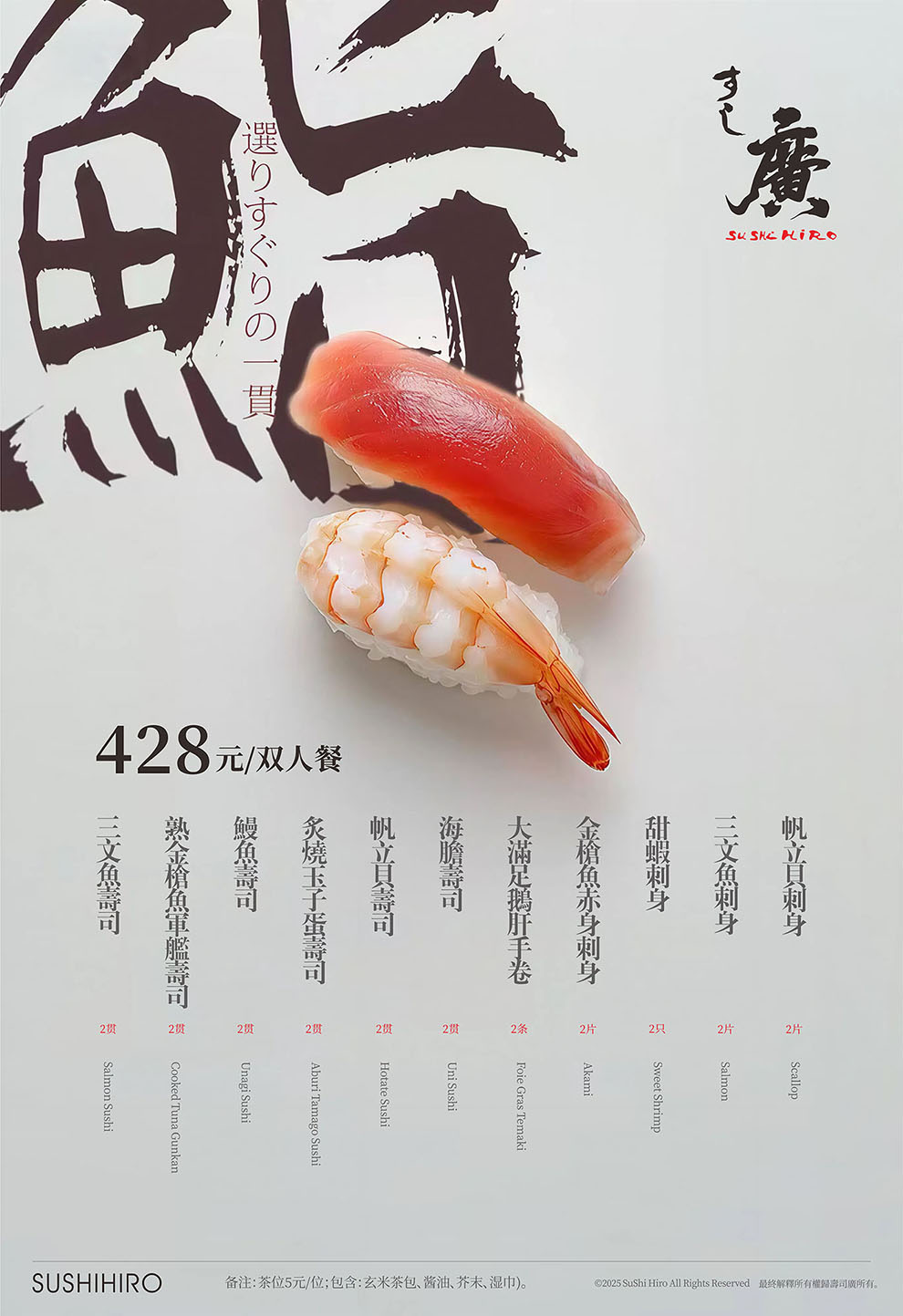 标志的设计,我们以中文字体为核心,邀请书法老师泼墨挥毫,中文名为:寿司廣,英文名为:Suhi Hiro,日文名:すし廣,通过不同高低大小,形成不同组合应用不同场景。