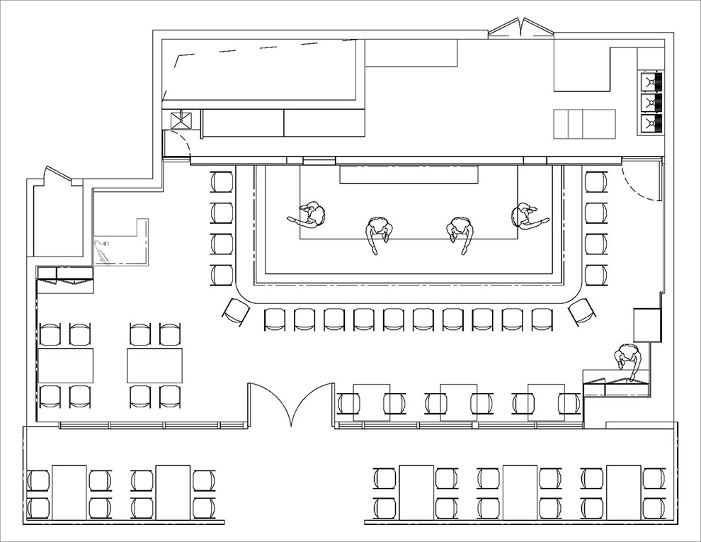 空间的设计,我们以原木风为主要风格,原木给人以温润的质感。板前寿司最大的设计就是吧台的设计,为了保证营业面积的最大化,吧台我们设计了20座位,另外设立了四人位二桌,可拼桌,二人位三桌,室内可以实现34个餐位,外摆四人位五桌,可以实现20个餐位,共54个餐位。