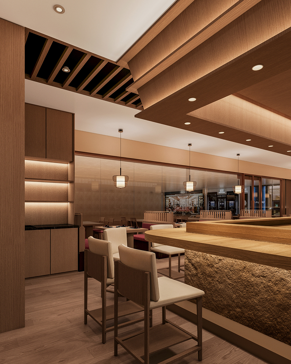 收银前台,杜邦纸灯膜与木线条相映成趣,中间香槟金不锈钢发光招牌;收银台整体木质结构,氛围灯光映照。