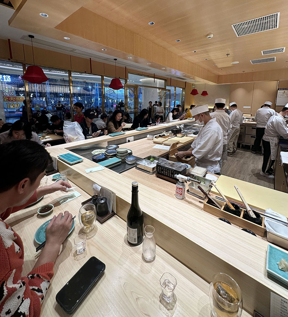 团队决定取消:回转模式,回到:板前模式。让消费者与板前师傅,能够面对面交流与体验,让消费者肉眼可见食物的新鲜与现制;也可以理解是让高高在上的Omakase走下神坛,让曾经少则人均五六百元每位,动辙人均数千的Omakase,回到人均200元-400元/位价位,回到平民阶段,能让大多数中产阶层都能消费得起,但又不至于跌落至人均七八十元的低价回转寿司中去,为了利润,牺牲品质,从而形成恶性的低价竞争。