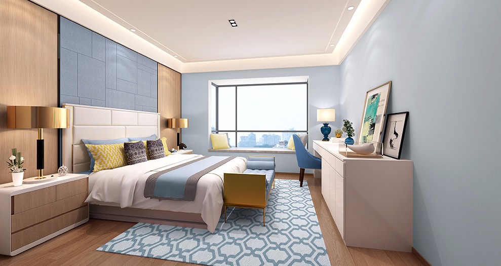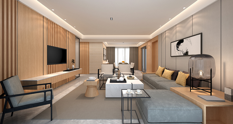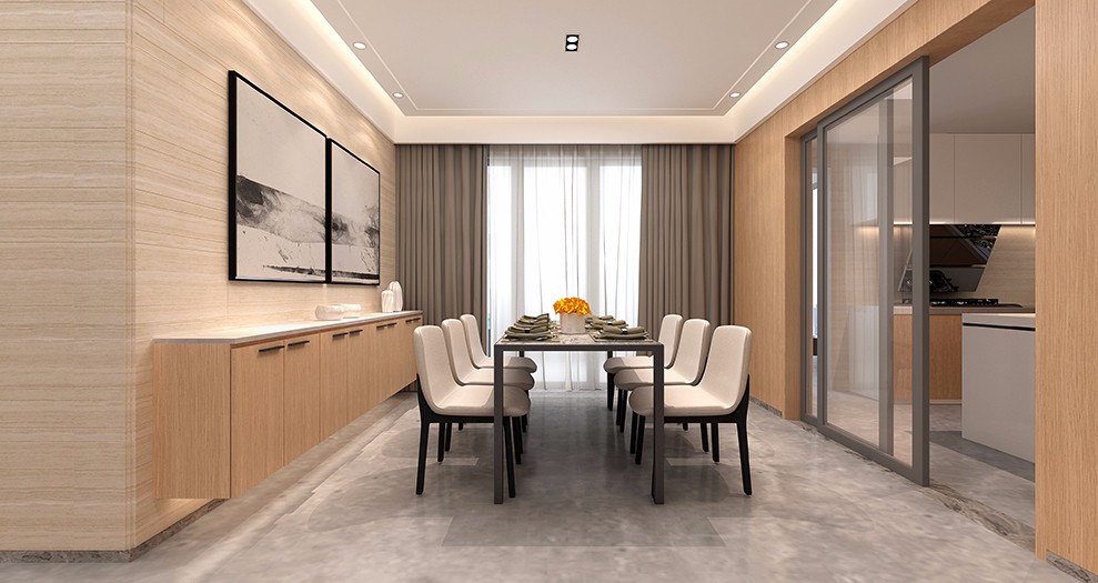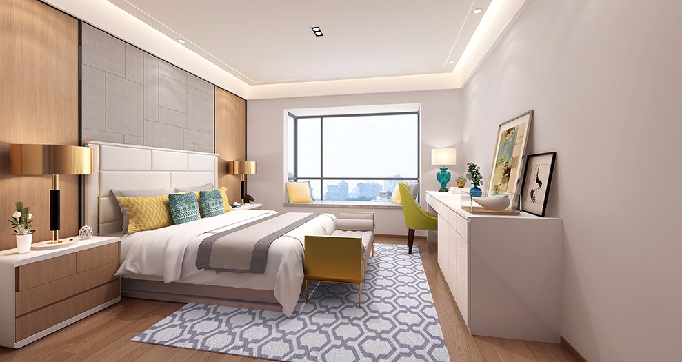 空间材料以木饰面、乳胶漆、大理石砖、硬包为主。空间的色系以明黄渲染整个场景,过道局部的处理,我们以玻璃区分,使整个过道显得宽广与通透。