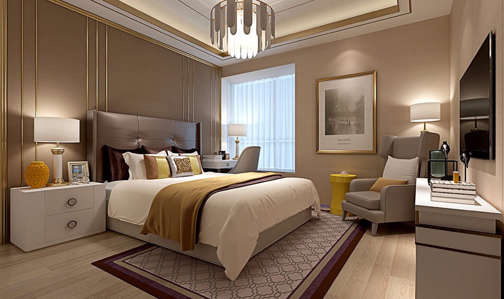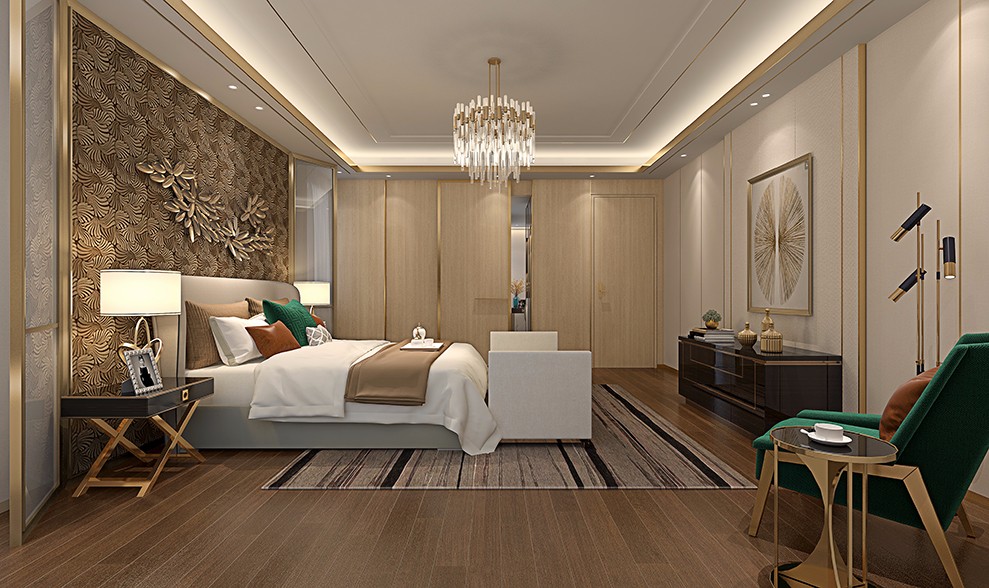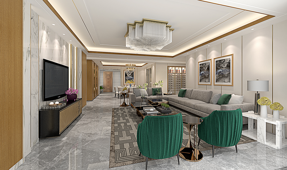 客厅的设计,电视背景墙主要以大理石为主,呼应着二边的饰面板柜子,搭配上墨绿的椅子,与灰调的沙发,整体个空间轻奢而优雅。