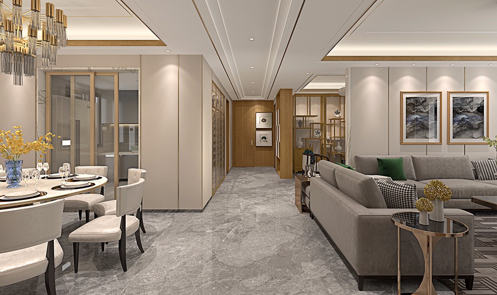 该住宅空间是我们回牛-潮汕牛肉火锅客户的私人住宅,面积约二百六十平方,为四口之家所居住,空间整体以港式轻奢为基调,地面采用灰色大理石为主,墙面以大理石、硬包、软包、饰面板为主,天花以灯带造型为主,配以香槟金不锈钢包边。