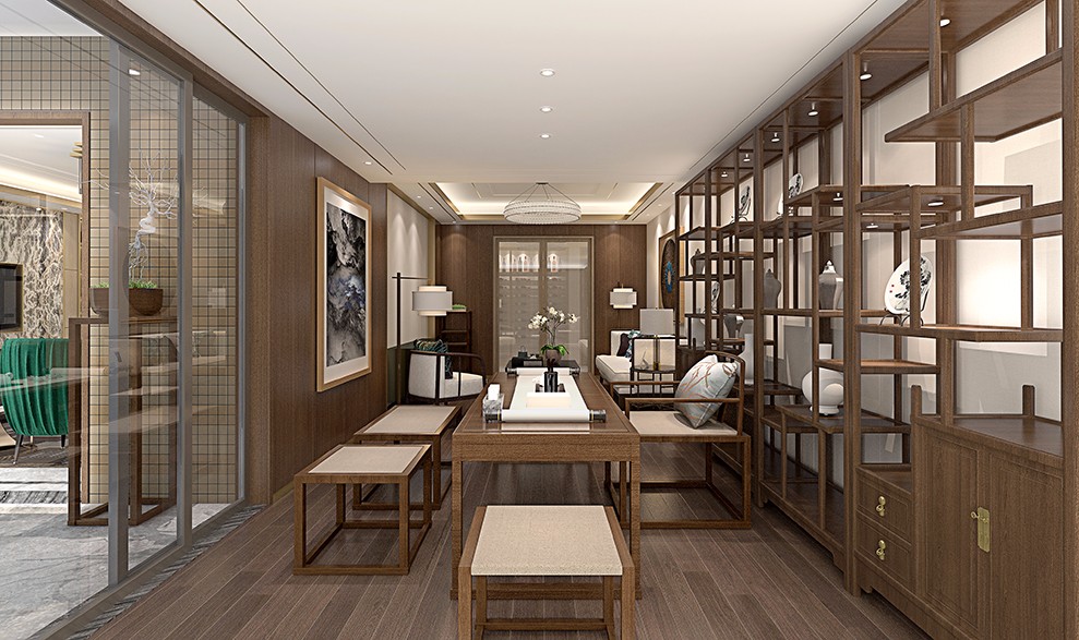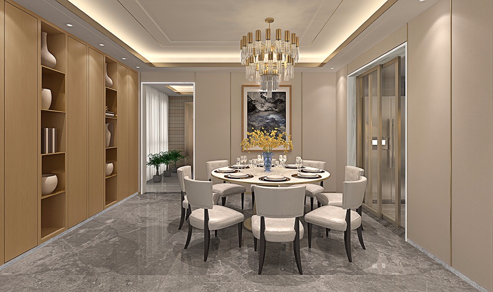 走过前厅,首先来到的是餐厅,可供八人同时就餐的餐厅区域,是一家人或朋友间与美食度过美好空间的区域,四周以硬包为主,左侧的木饰面酒柜可以用来藏酒所用。