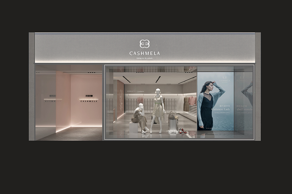 内凹式入口设计,一面橱窗摆放模特与品牌调性海报,简洁的入口小空间,给人神秘感与仪式感,让顾客从入门便开始满怀期待。衣物背景墙使用绒线筒排列作为造型,让顾客第一眼便能感受到极强的羊绒的元素,更衣室墙放置品牌IP(Cashmere Lady),一根绒线串起(20-30-40-50)每个年龄段,轻柔、舒适的相伴,内外兼修,完美人生。空间场景整体呈现温馨舒适感,充分契合开希米娜产品所带来的品质,以场景氛围营造为核心,注重传递开希米娜给人带来的感受。