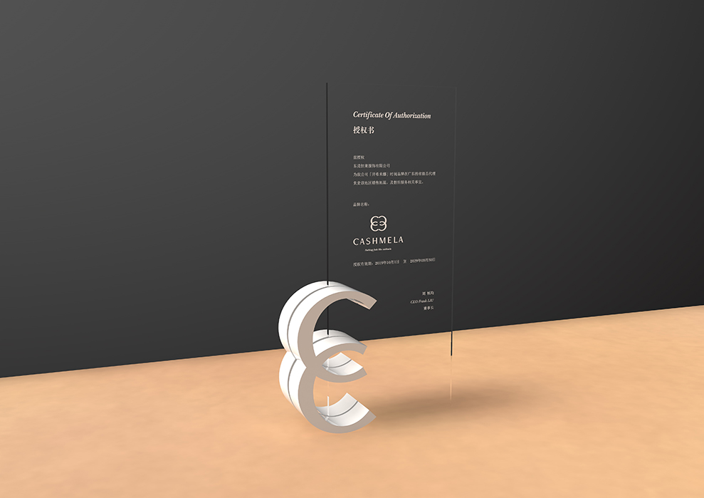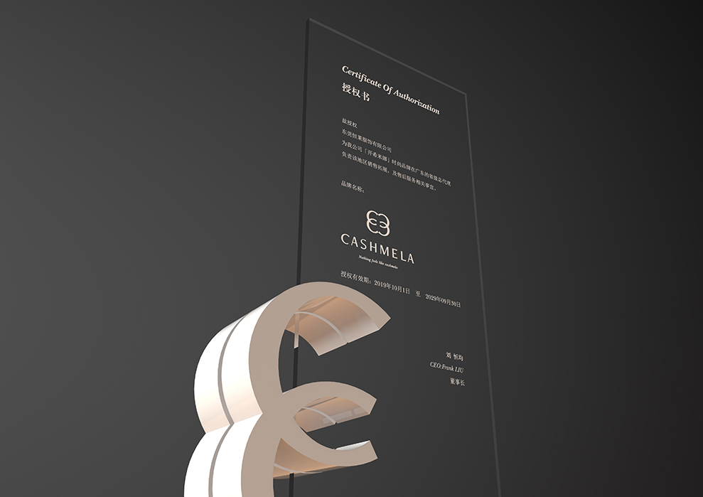 用铝合金材质制作而成,主要体现出logo的质感,中间夹着使用UV打印的授权加盟书玻璃板。给人强烈的高级与信任感。