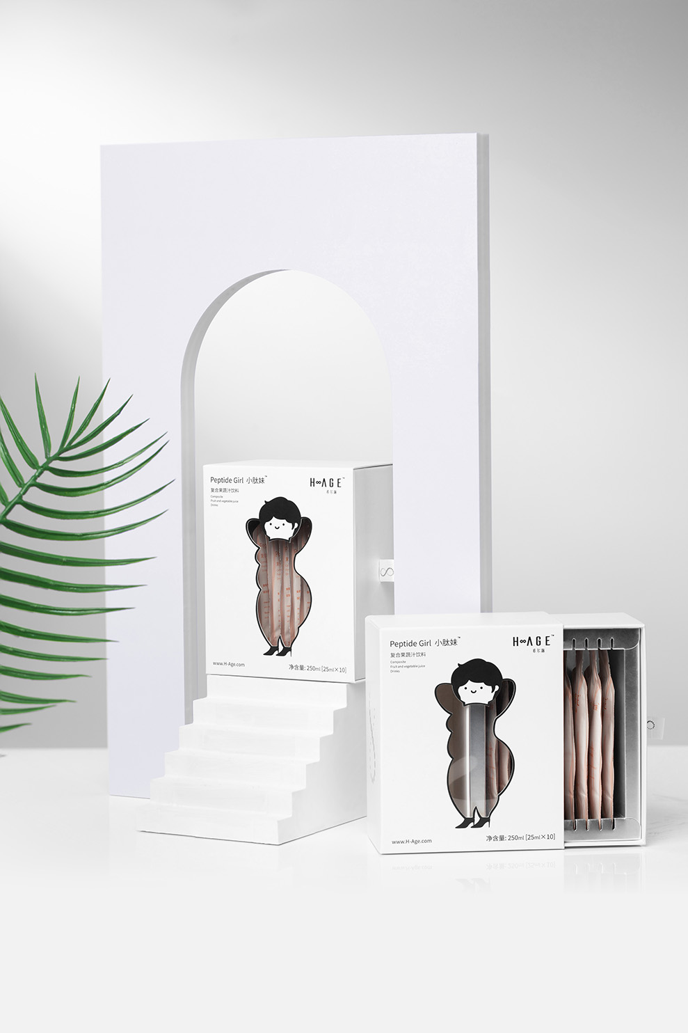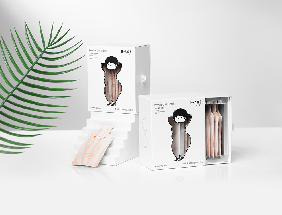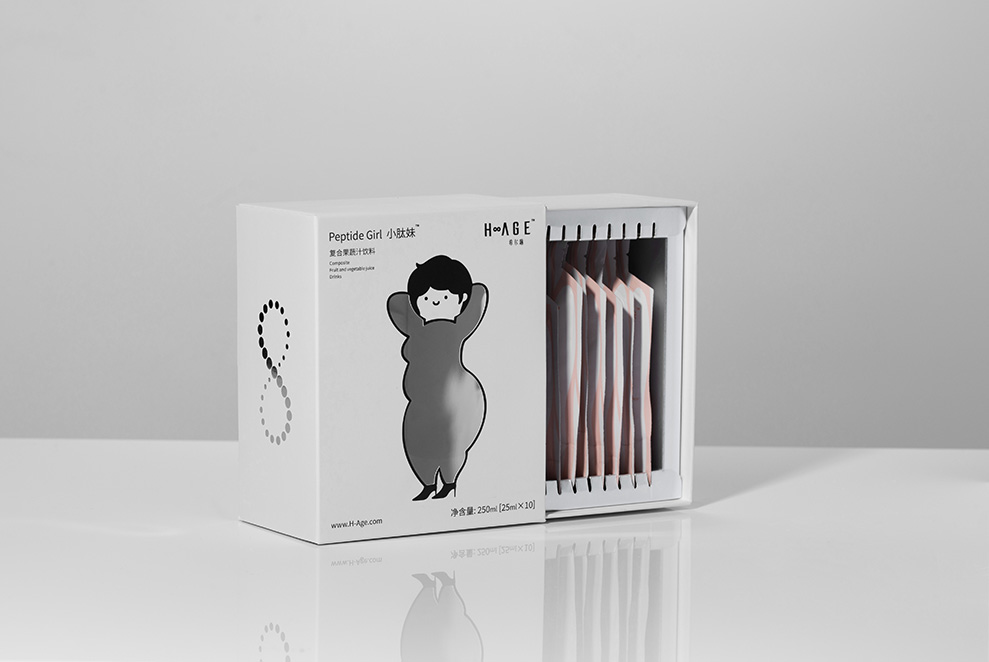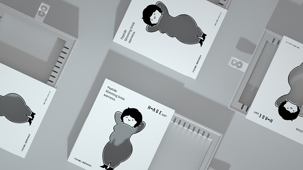 包装盒是以胖女人的形象作为封面,人物主要以简约线条和色块组成,身体部分镂空处理。内盒做了卡槽承载,更好的固定产品,颜色使用光银色,抽出内盒的时候会让人眼前一亮,同时强调产品的科技感,整体设计完全延续希尔琳的风格调性。