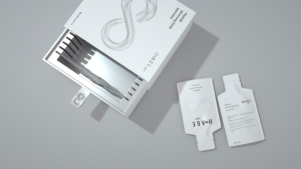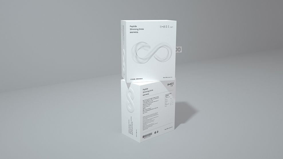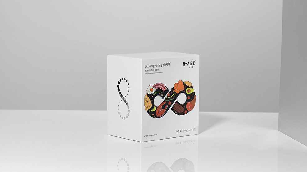包装盒正面主视觉围绕品牌LOGO里的无限、无穷的符号设计,封面图是一个用环形串连起来的无限大符号,无限大符号上布满日常摄取到的食物,把这个环状结构比喻成无限循环的、通畅的人体肠道,健康的肠道能更好的排毒,消除油脂达到减肥瘦身的效果,舒适的色彩搭配给人一种食欲感,功效与痛点结合,吸引主义的同时加深购买意向。