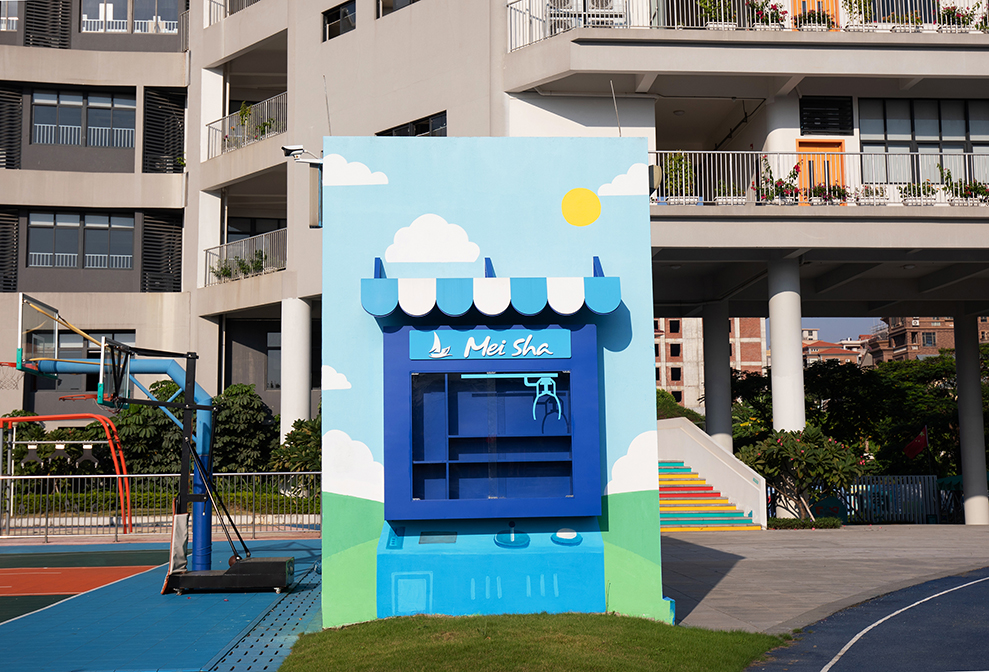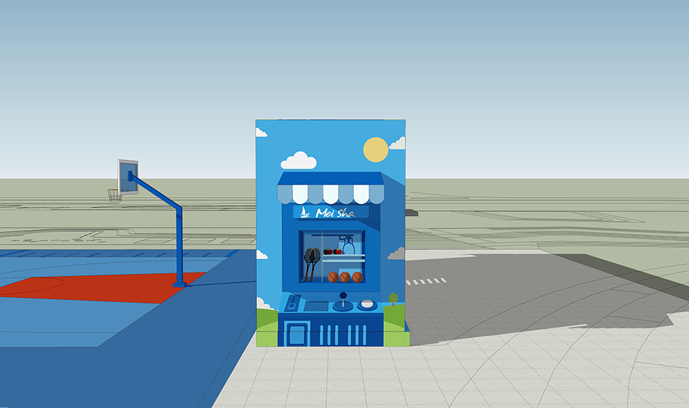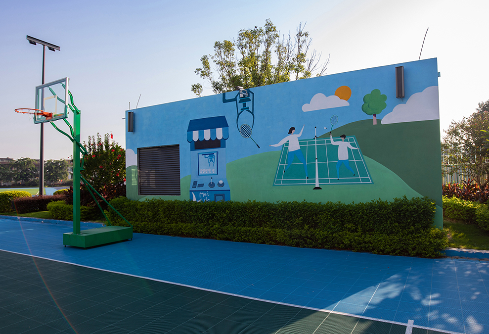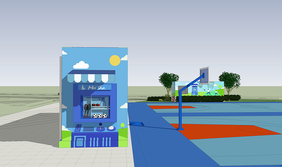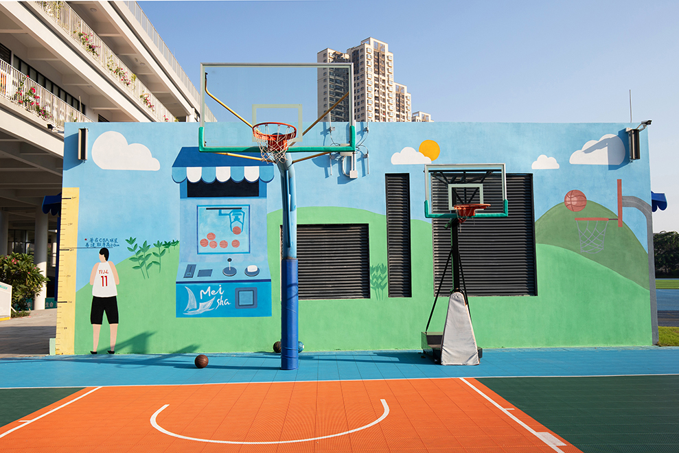 娃娃机里的篮球与画面右侧的半个篮球架子,因为这面墙面对的是篮球场,设计师为了整体调性融合,所以插画运用元素都是与篮球相关的。