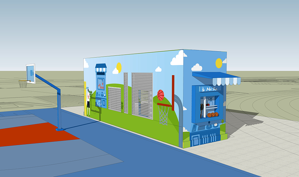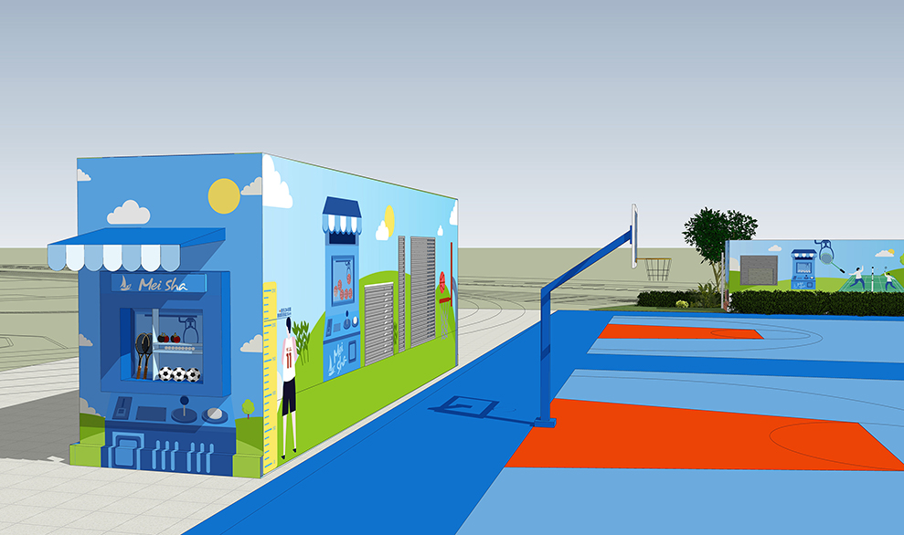 B、D面墙,设计的出发点在于打造一个让学生们「运动更加便捷」的场景,所以用娃娃机主体去设计了一个「运动器材的储物柜」。大大节省了学生们寻找体育器材的时间,减少了因为没有体育器材而无法进行体育运动的机会。
