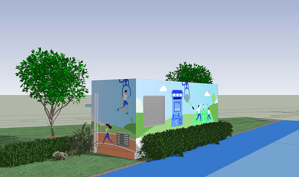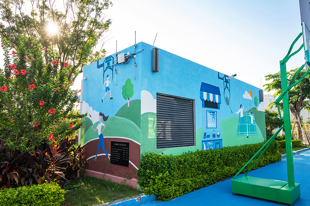 根据整体操场在地颜色-蓝色,来规划整个电房的主题用色,为了让电房在操场不显得突兀,我们运用了大量与操场相近的蓝色系去设计整个电房。