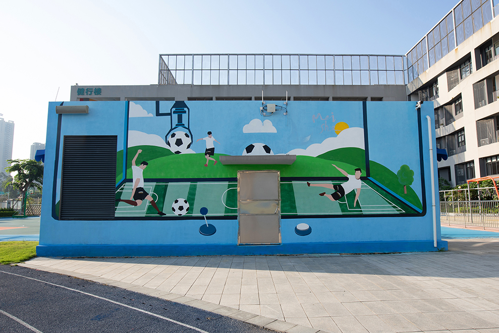 A面墙面对足球场,是同学们课后在绿茵场上奔跑的场所,为了呼应整个场所,采用了足球运动的场景主题去完成整幅画面效果。在足球主题的基础上,生动地加入了「娃娃机」元素,让路过的人仿佛以第一视角去操控这台「娃娃机」,满足同学们的游戏心理,提高同学们的运动积极性。