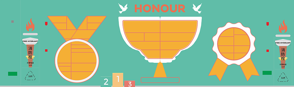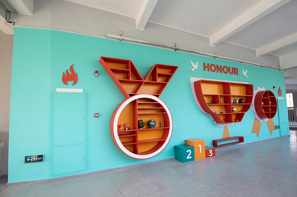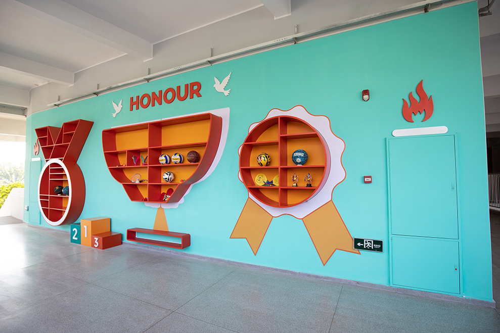 整个场景都是围绕「荣誉」为主题,用奖杯与颁奖台的形式去呈现一个整体画面。学生们可以在观赏别人用汗水与时间换来的「荣誉」同时,心里默默藏有一份激情,随时随地拿起墙上的体育器材去进行运动。颁奖台的设计不仅是为了融入主题画面,还可以帮助拿不到高处体育器材的同学们做为一张垫高小凳子去拿体育器材。