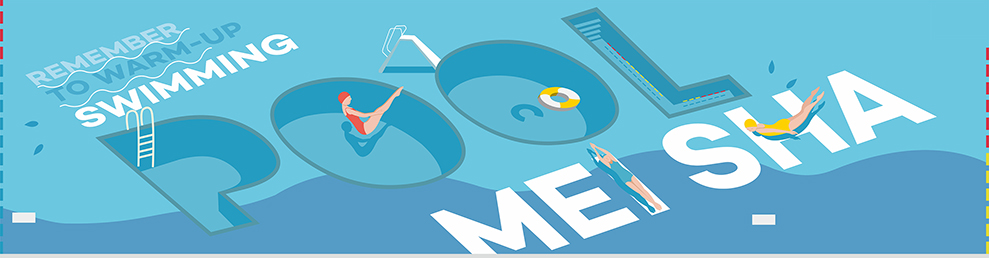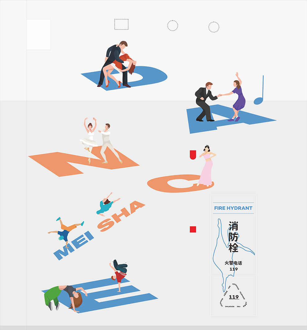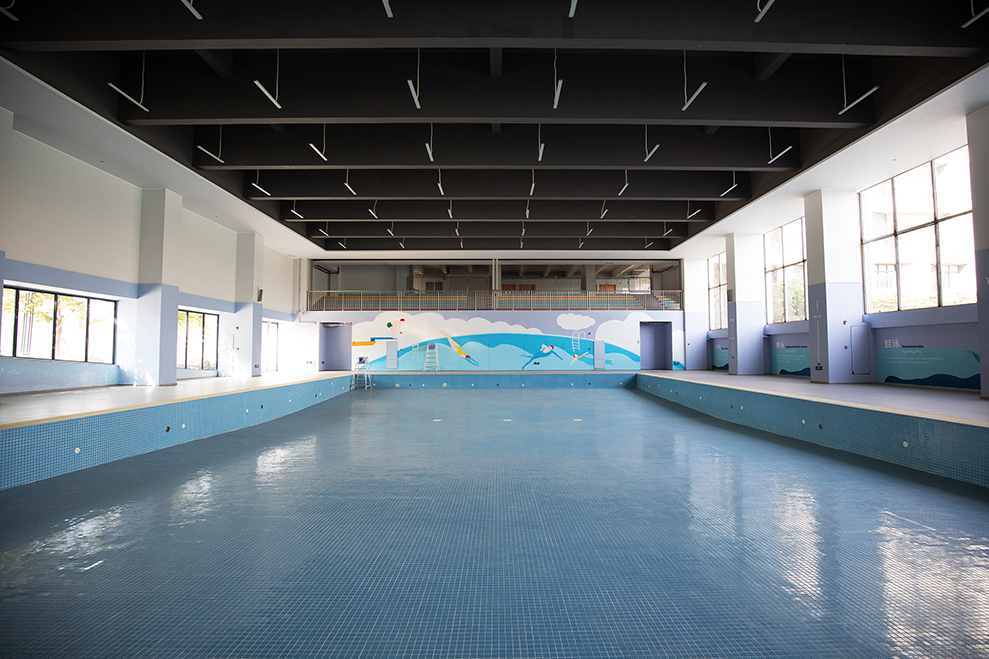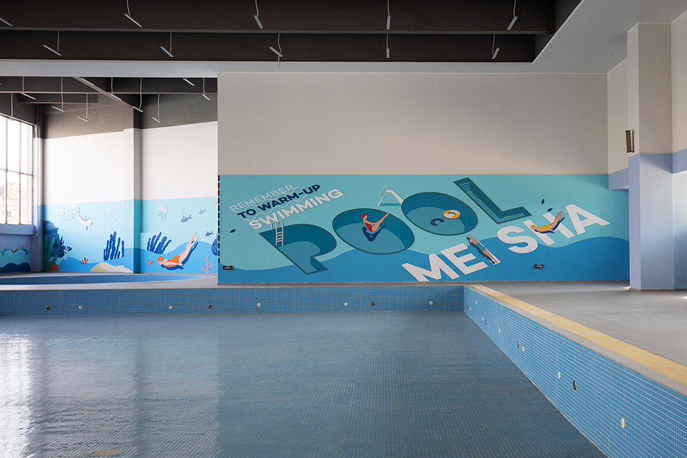 整体色调运用了偏柔和的蓝色系,融入整个游泳馆氛围中。第一面墙,运用了2.5D的效果对「pool」进行了字体设计,配以救生圈、扶手架等其他元素;右下角还用了泳姿对梅沙小学的英文「meisha」进行趣味设计。