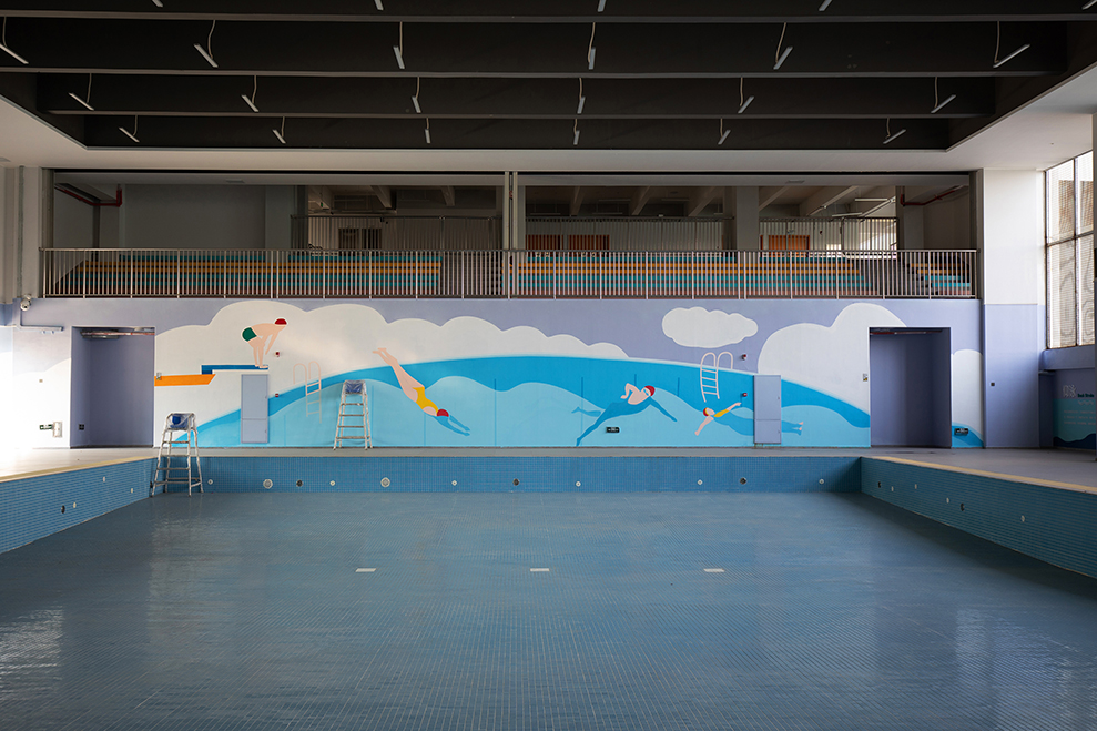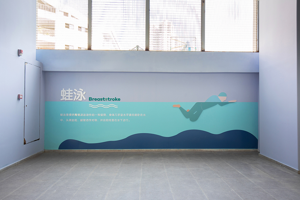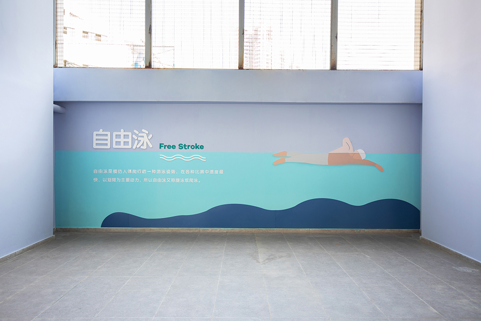 第三面墙,描绘了由进水前到出水后的姿势场景,展现出放松、自由的运动氛围。