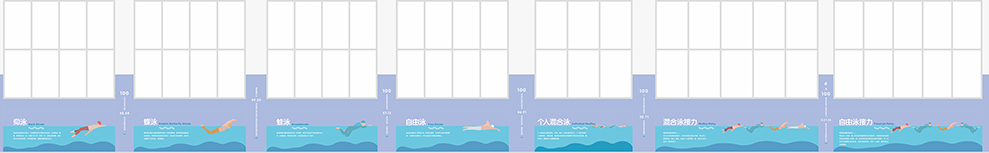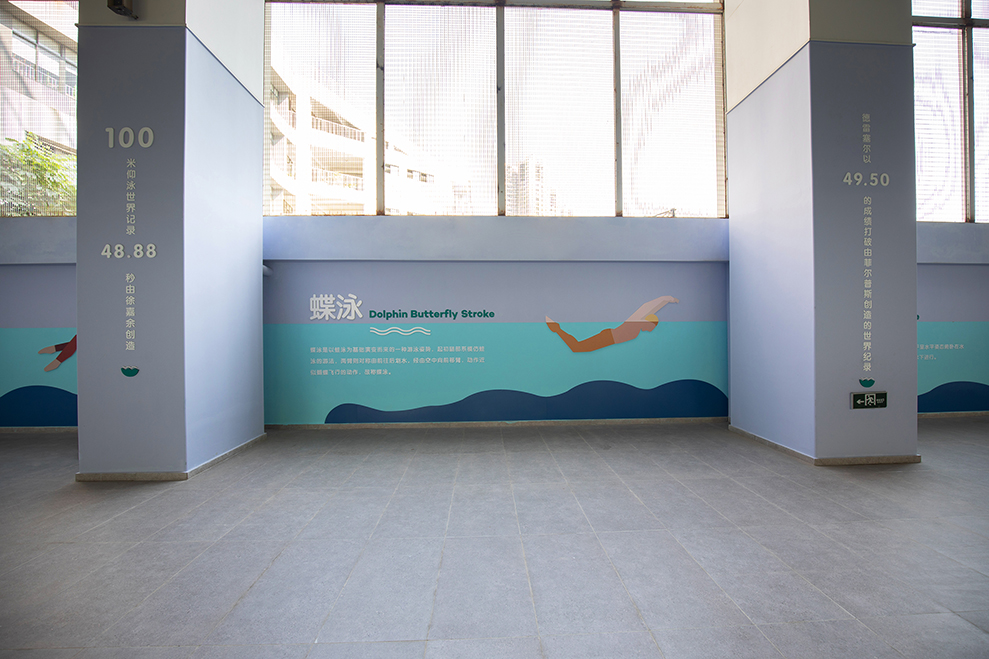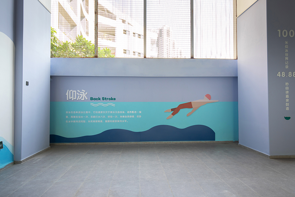 第四面墙,介绍每一种泳姿和游泳比赛的项目,每个项目有相对应的世界纪录成绩,搭配插画展示泳姿及文字介绍,以简单直接,学生更容易接受的方式,全面普及游泳相关的知识。