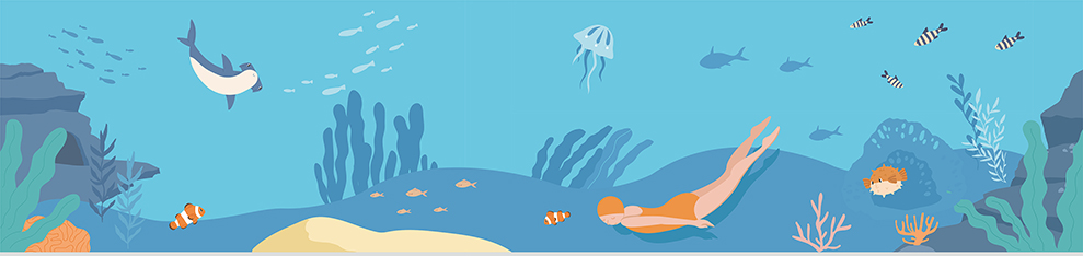 第二面墙,用一个大幅的插图绘制,描绘了海底世界的视角,有珊瑚和海鱼陪伴着同学们去探索海底世界。