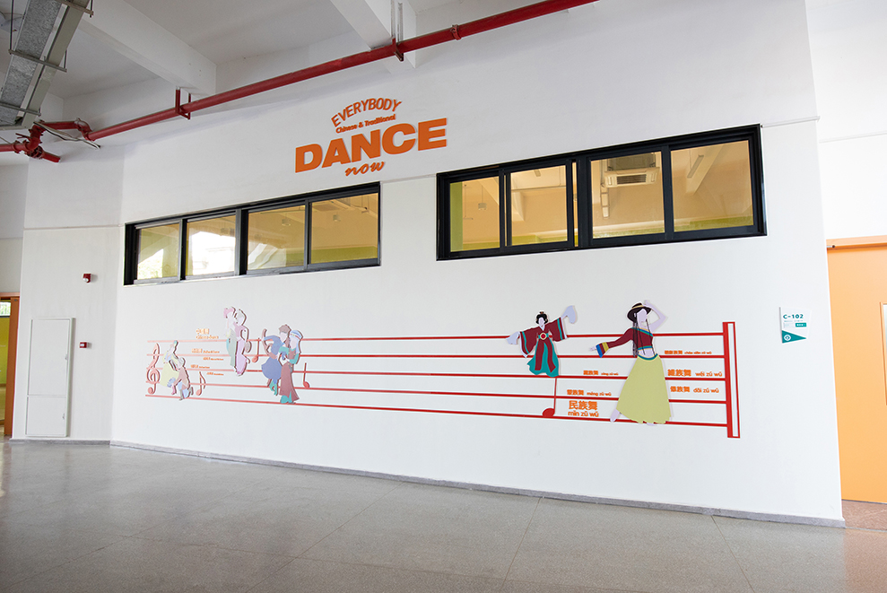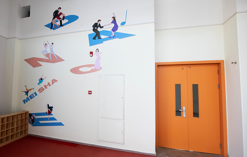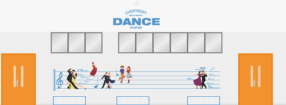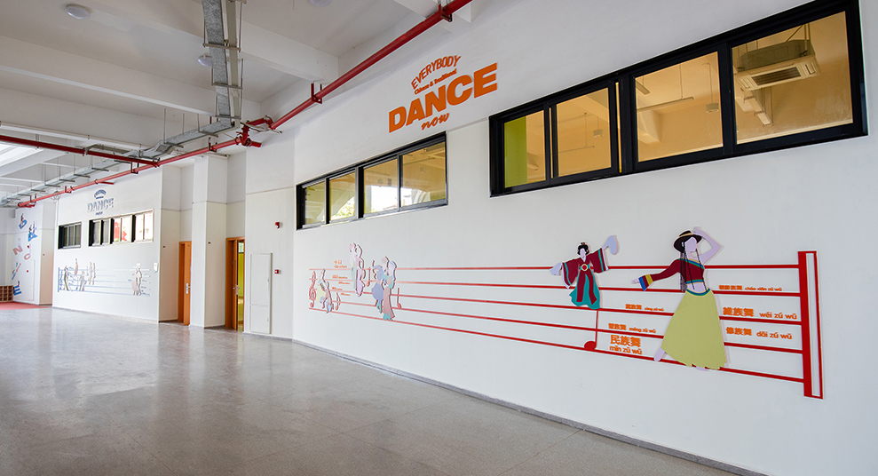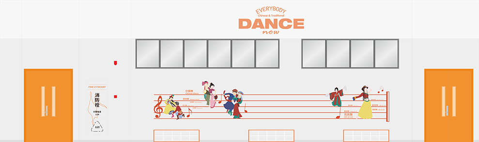 舞蹈室外立面包装以中国舞蹈和国外舞蹈为内容,用插图的形式表达。