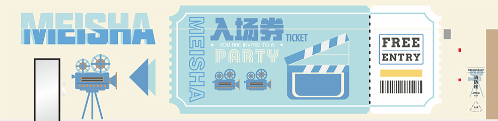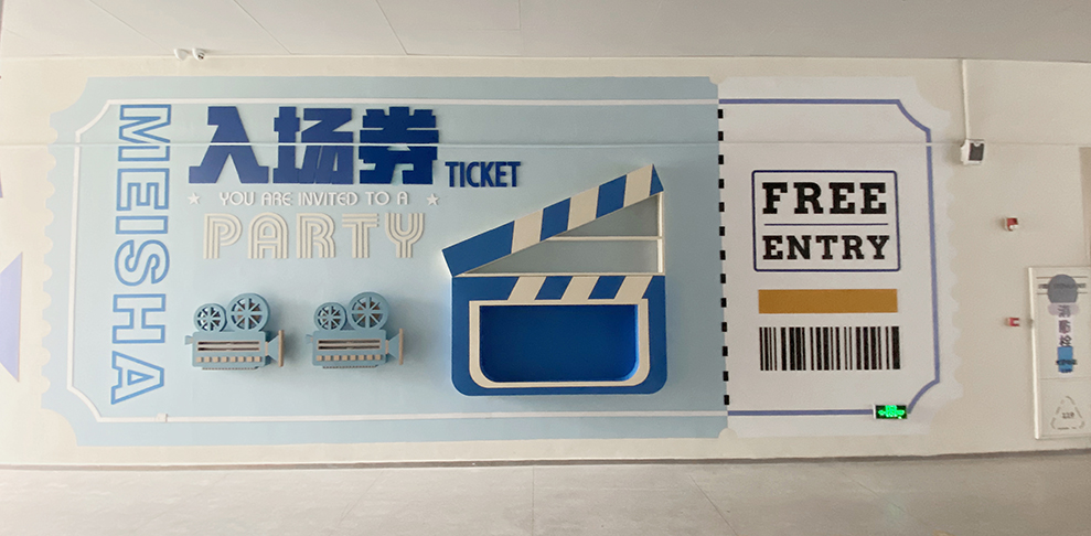 整体色调运用了蓝色系为主,与小剧场对面的游泳馆用色相呼应;两台放映机设计了可以抽拉的胶卷,胶卷的内容都是为中国作出贡献的名人简介;场记板的下方是可以给小剧场场外候场的观众互动的手印泥;上面的白色隔层就是可以用来展示获奖奖杯的装置。